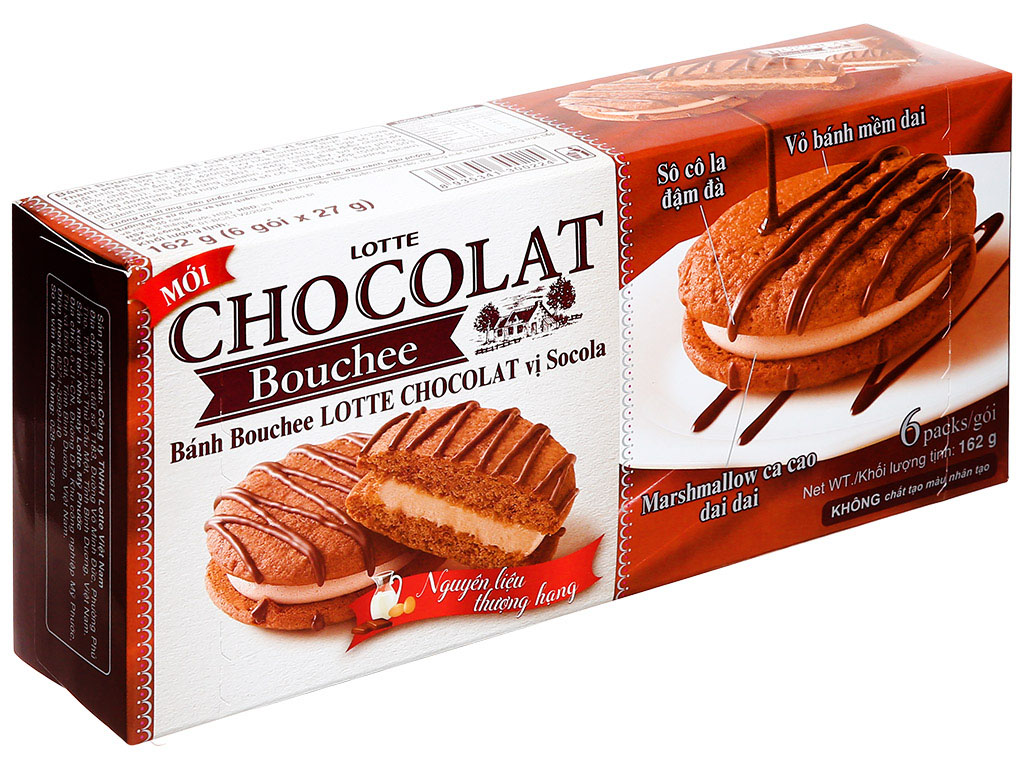 Bánh bouchee là loại bánh nổi tiếng tại Pháp với chiếc bánh có lớp vỏ giòn kết hợp cùng nhân kem socola thơm béo nhẹ. Tuy có vị ngọt và béo nhưng bánh bouchee Lotte lại không gây cảm giác ngấy để phù hợp với khẩu vị của đa số người tiêu dùng.