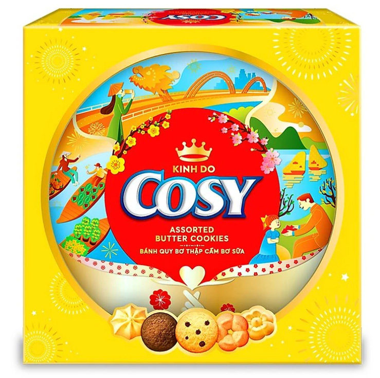 Bánh quy bơ thập cẩm bơ sữa là một sản phẩm của thương hiệu Cosy – thuộc công ty Mondelez Kinh Đô, nổi tiếng với các loại bánh kẹo thơm ngon, bổ dưỡng và an toàn cho sức khỏe. Được làm từ các nguyên liệu chất lượng cao, như bột mì, bơ, sữa, hạt dưa, hạt mè và các loại hương liệu tự nhiên. Bánh quy có hình dạng tròn với nhiều kiểu dáng, mỏng, giòn tan, thơm béo và ngọt dịu. Bánh thơm ngot, phù hợp với sở thích của nhiều người, nhiều độ tuổi.