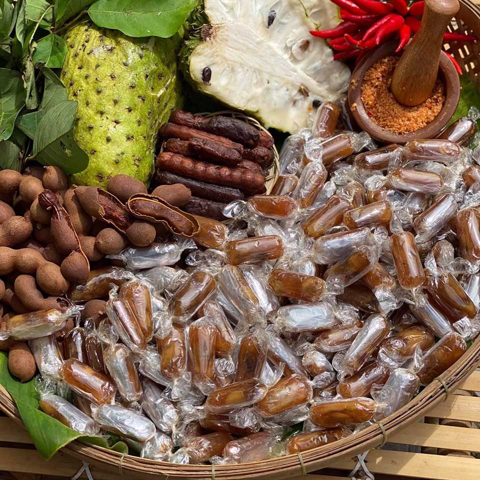 Kẹo Mãng Cầu Me có vị chua ngọt của mứt giúp cho con người lớn trẻ em tăng thêm sức đề kháng vào lúc thời tiết giao mùa những ngày Đầu Xuân.