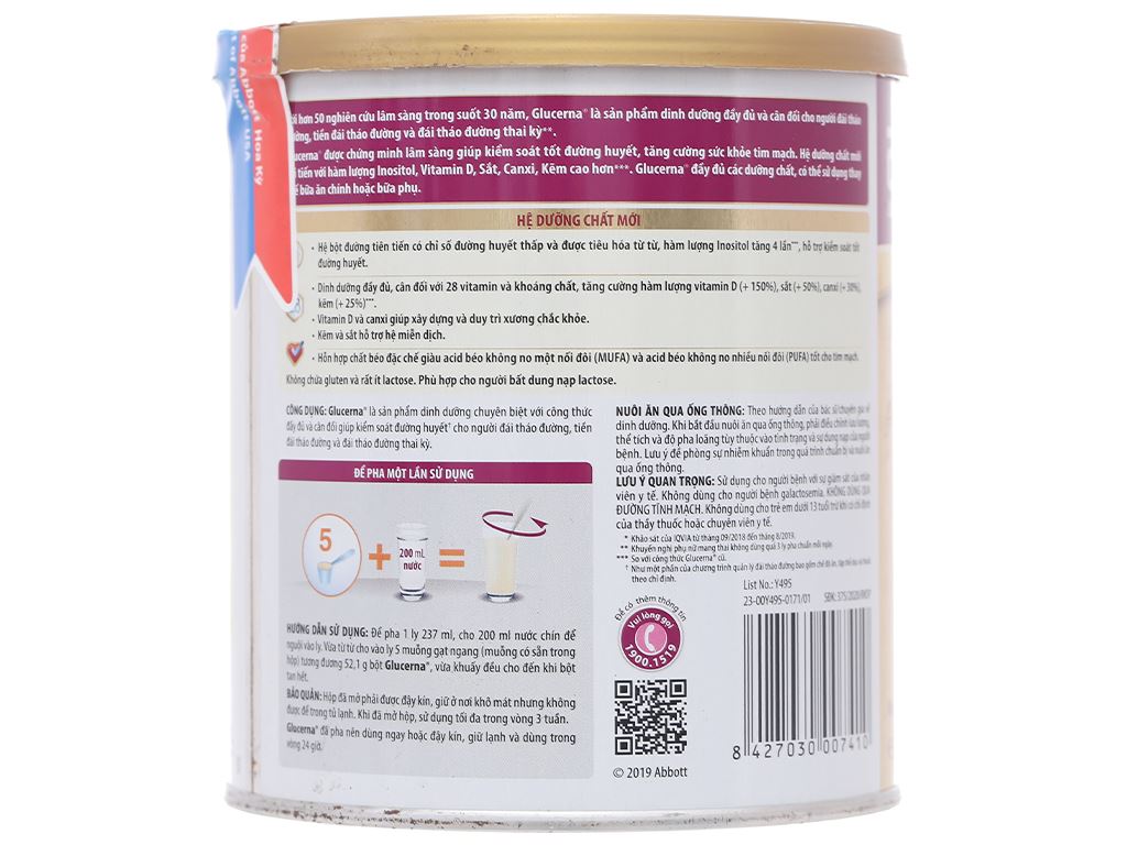 Để pha 1 ly 237 ml, cho 200 ml nước chín để nguội vào ly. Vừa từ từ cho vào ly 5 muỗng gạt ngang (muỗng có sẵn trong hộp) tương đương 52,1g bột Glucerna, vừa khuấy đều cho đến khi bột tan hết.